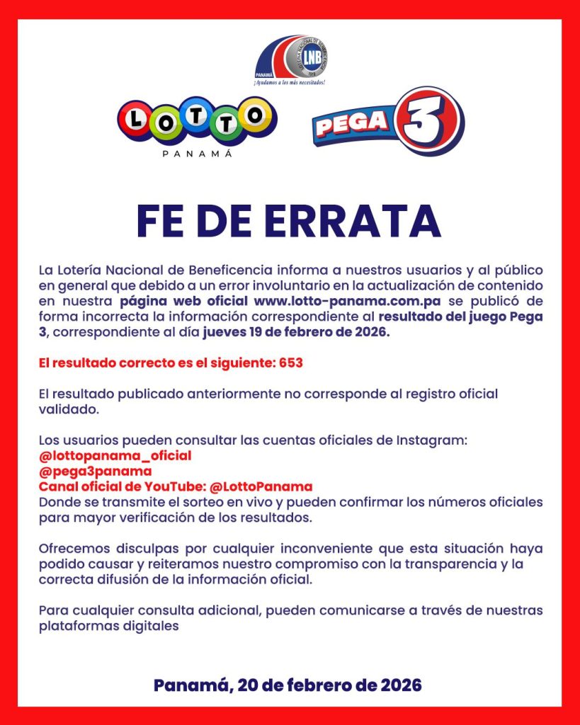 Sorteos: Los sorteos de Lotto y Pega 3 se realizan todos los martes y sábados a las 8:00 p.m. (hora de Panamá). Se transmiten en vivo por canales locales, redes sociales (IG y TikTok) y en la plataforma digital Youtube.